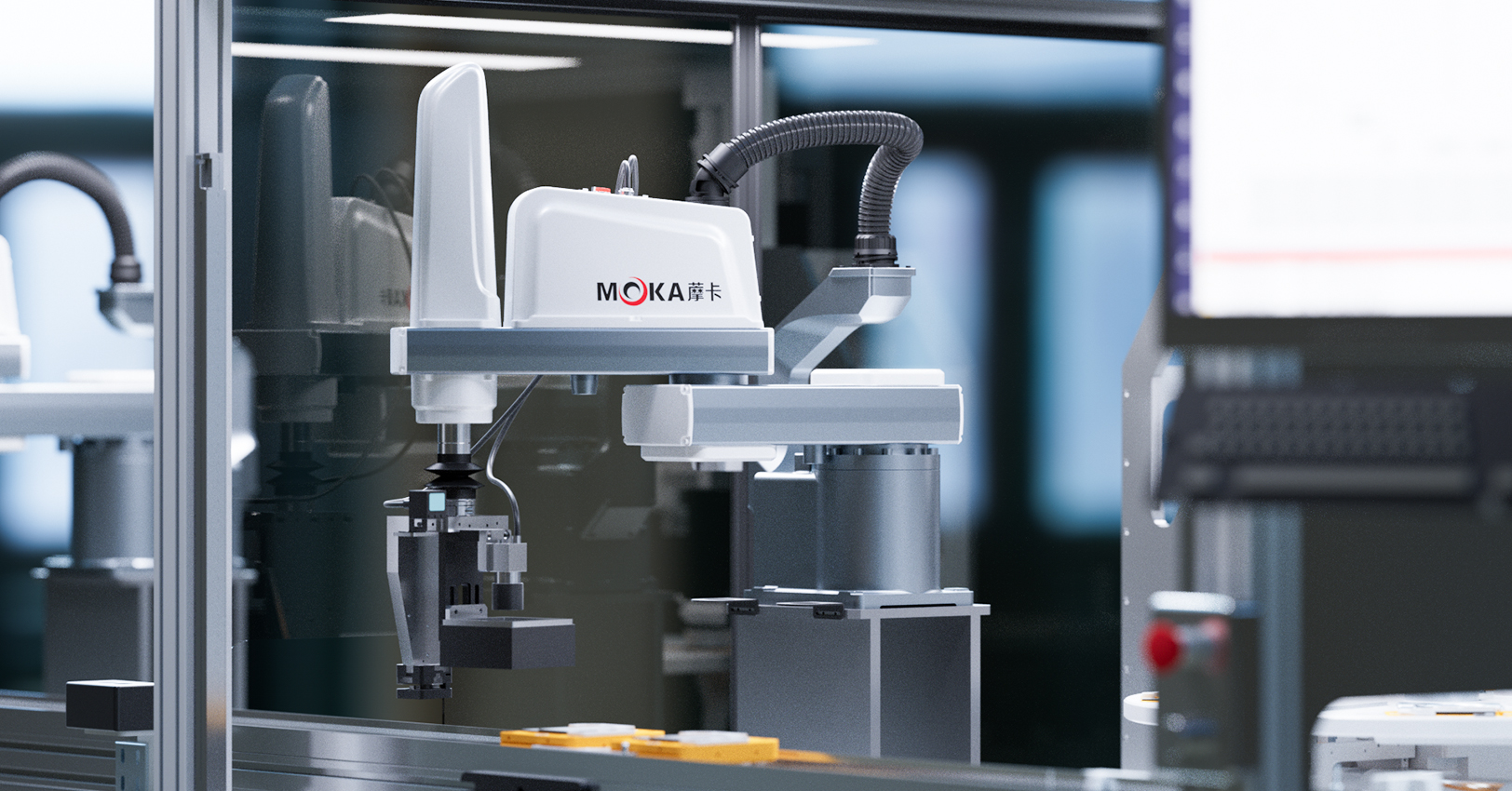 選擇順應性裝配機器手臂,是一種圓柱坐標型的特殊類型的工業機器人。SCARA機器人有3個旋轉關節,其軸線相互平行,在平面內進行定位和定向。另一個關節是移動關節,用于完成末端件在垂直于平面的運動。